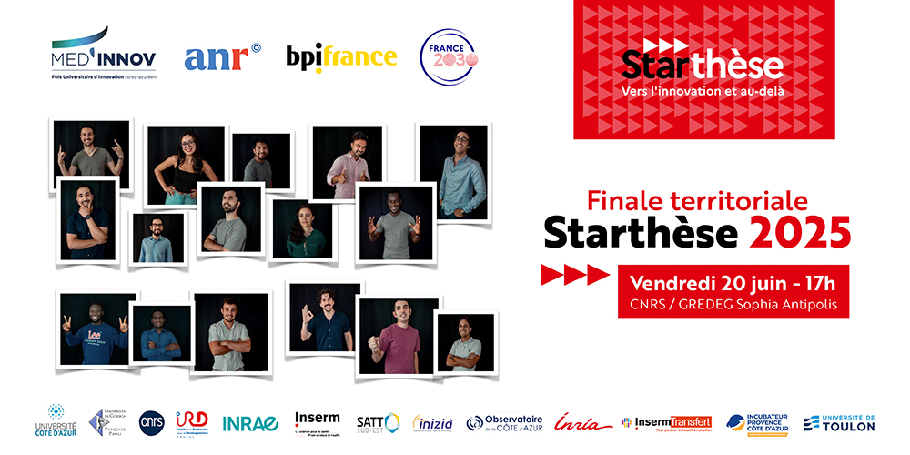 La finale régionale du concours Starthèse édition 2025 a lieu ce vendredi 20 juin au GREDEG à Sophia Antipolis, dans le cadre de la Commission Innovation Valorisation du Pôle Universitaire d’Innovation MED’INNOV,dans sa formation Stratégique. L’objectif de ce concours : encourager les vocations entrepreneuriales des doctorants et jeunes chercheurs!